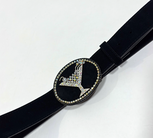 Martini Crystal Rhinestone Leather Black Statement Belt - L/XL