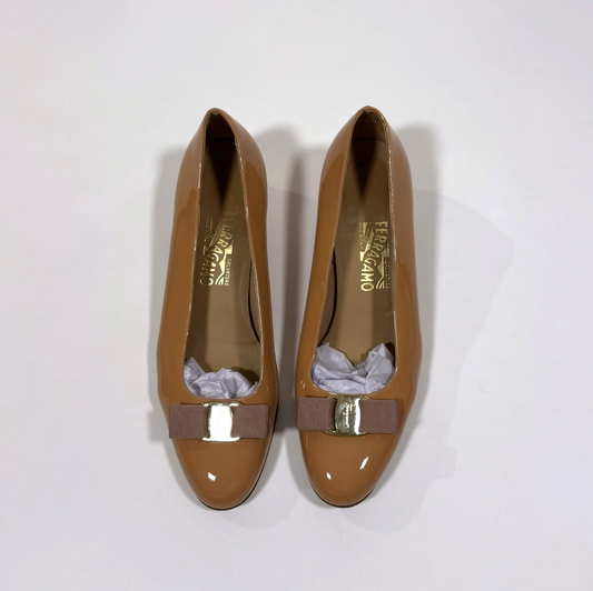 Salvatore Ferragamo Vara Block Heel Bow Pumps Caramel - 10.5