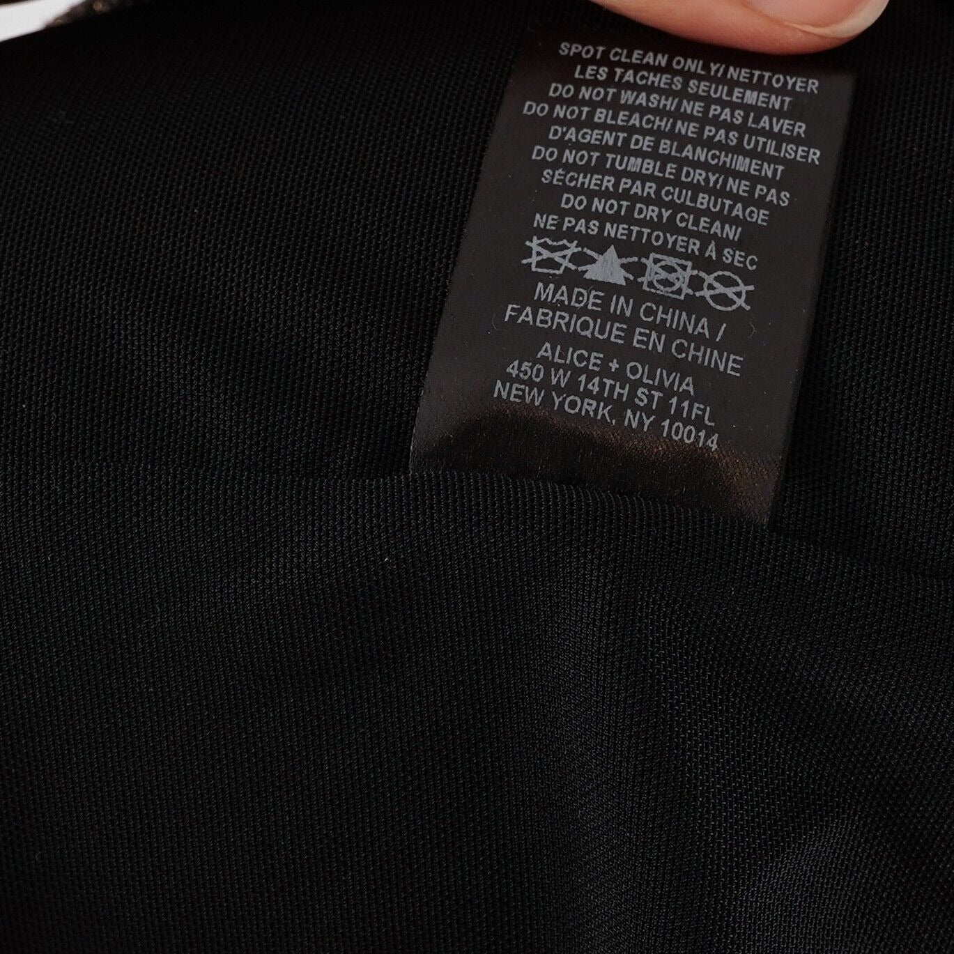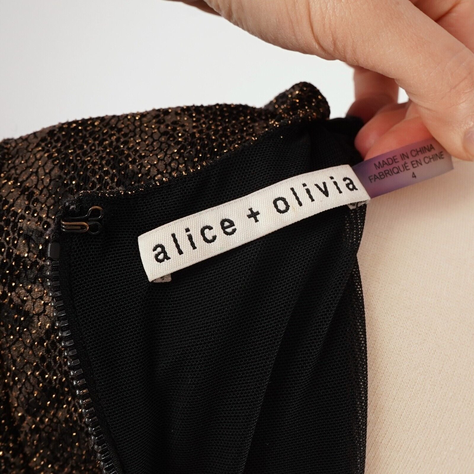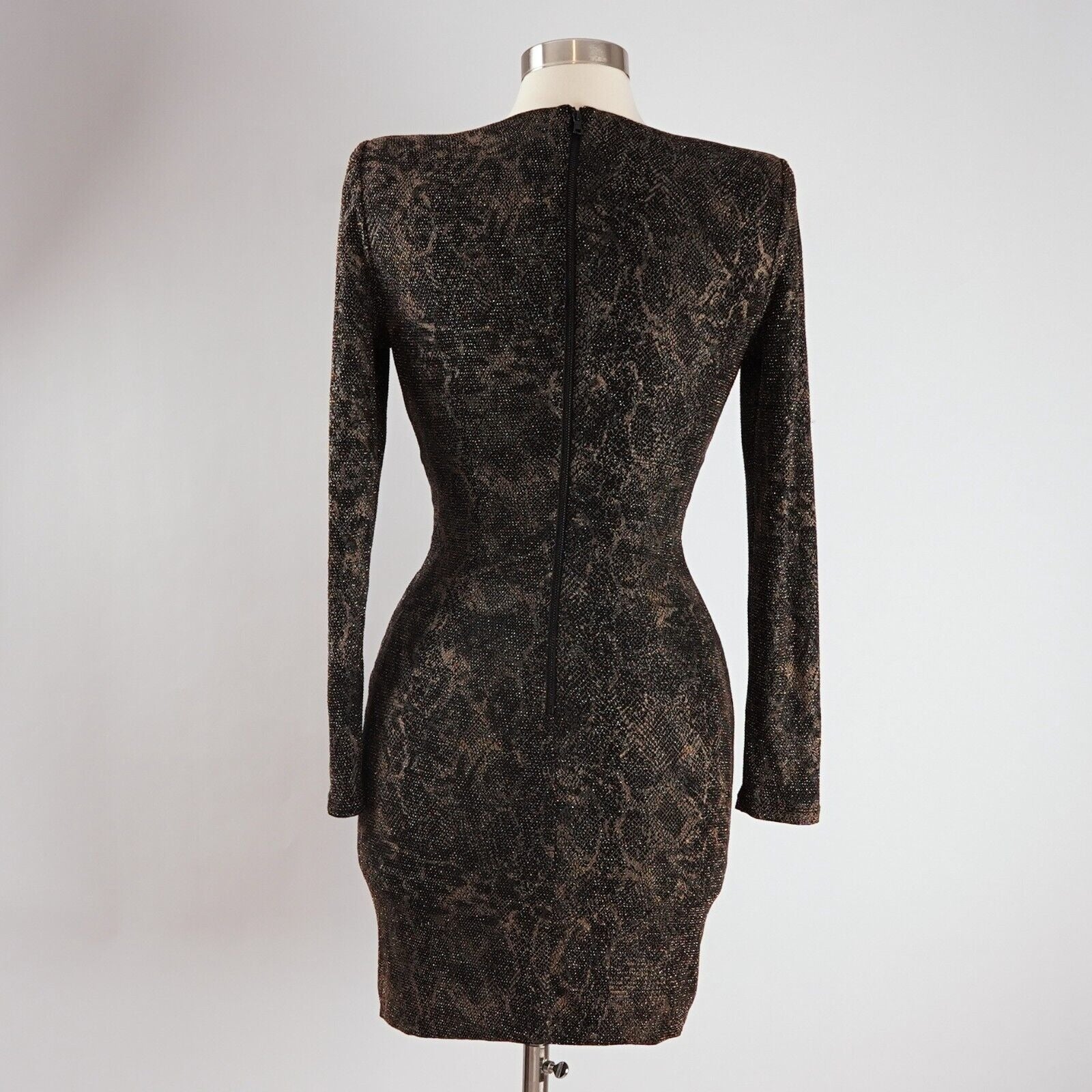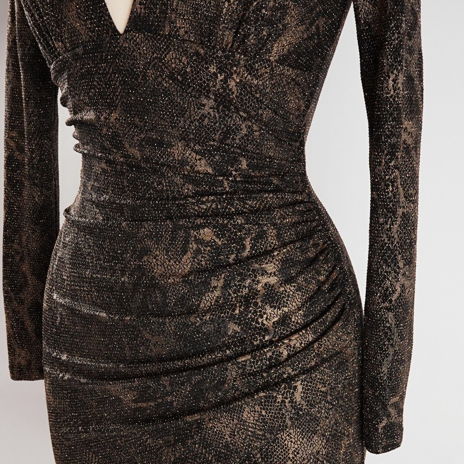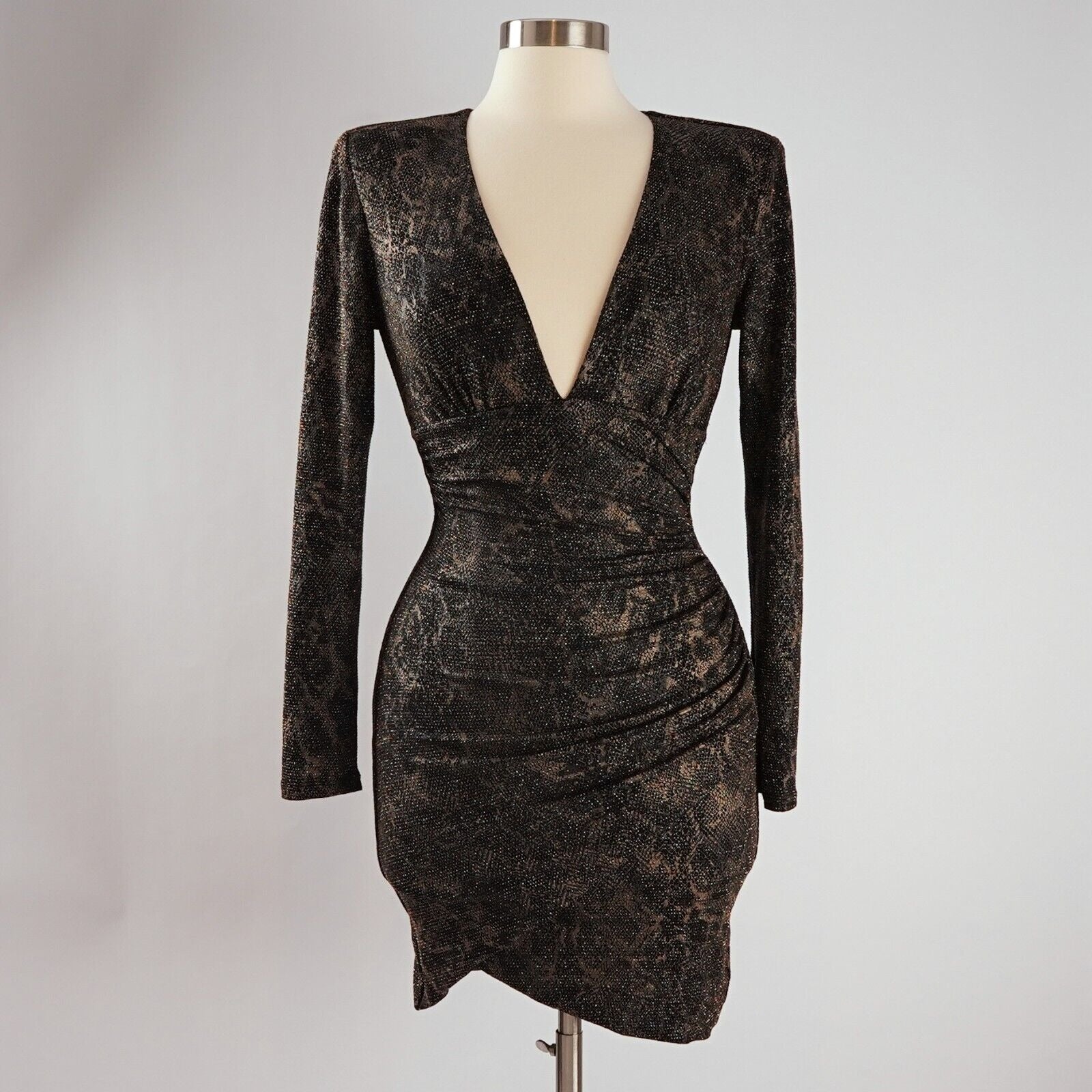 Deep V-Neck Ruched skirt Long sleeve Shoulder pads Exposed back zipper 87% Nylon, 8% Metallic Polyester, 5% Elastane (Fabric has great stretch!)