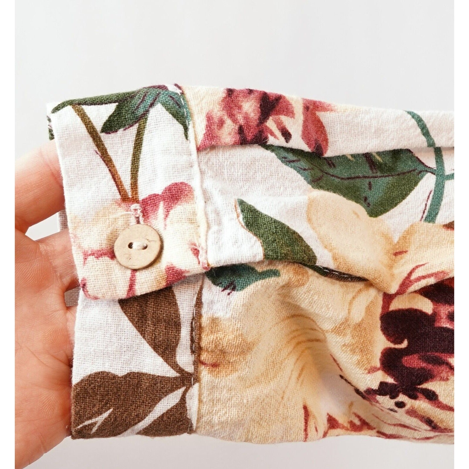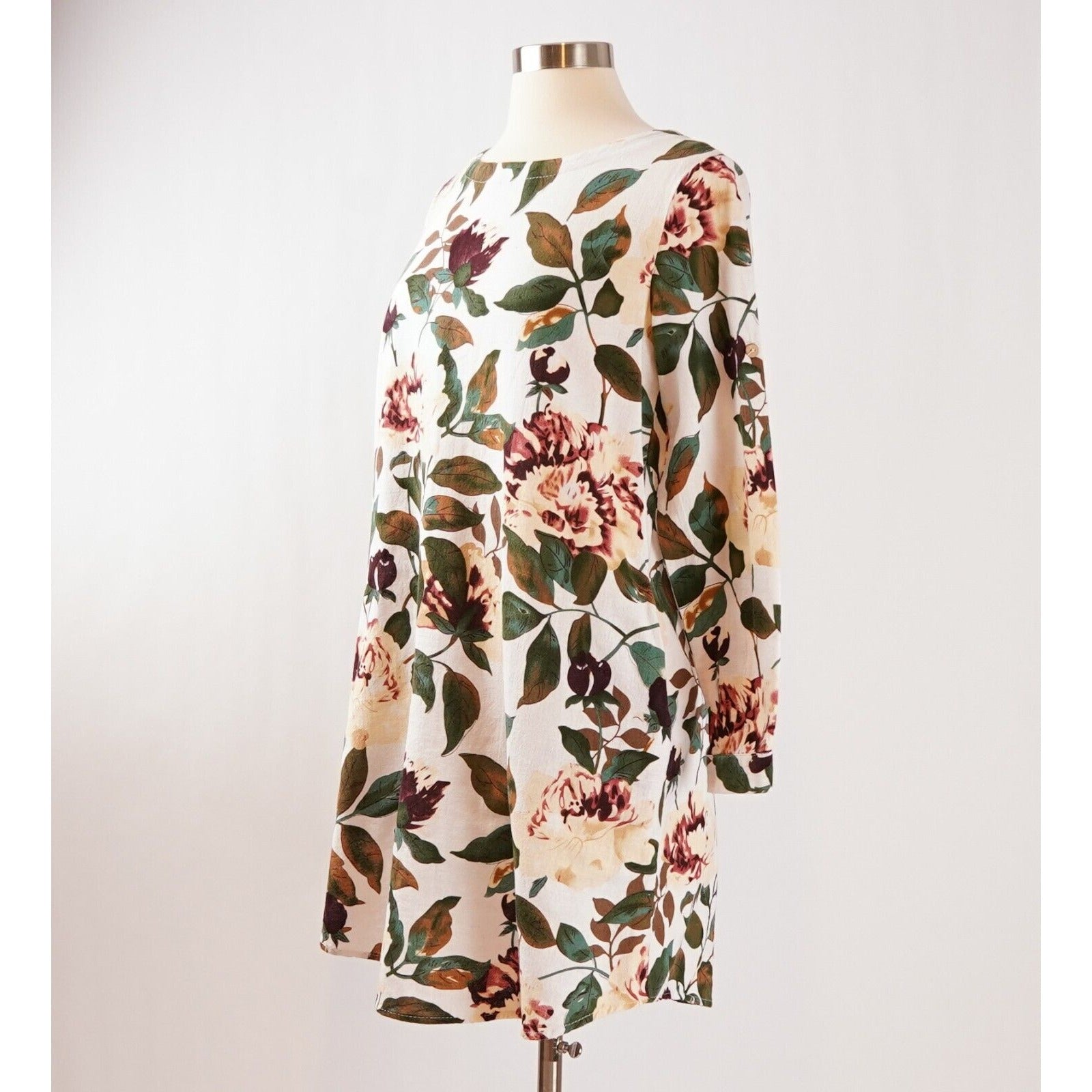 Floral print round neck dress with three-quarter turn up sleeves with button fastening. Style it by rolling the sleeves just above or below the elbow. Relaxed Fit with pockets!