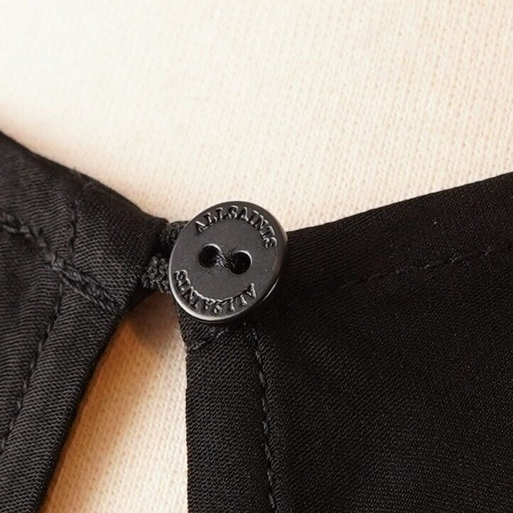 Keyhole and button fastening at the back of the neck
