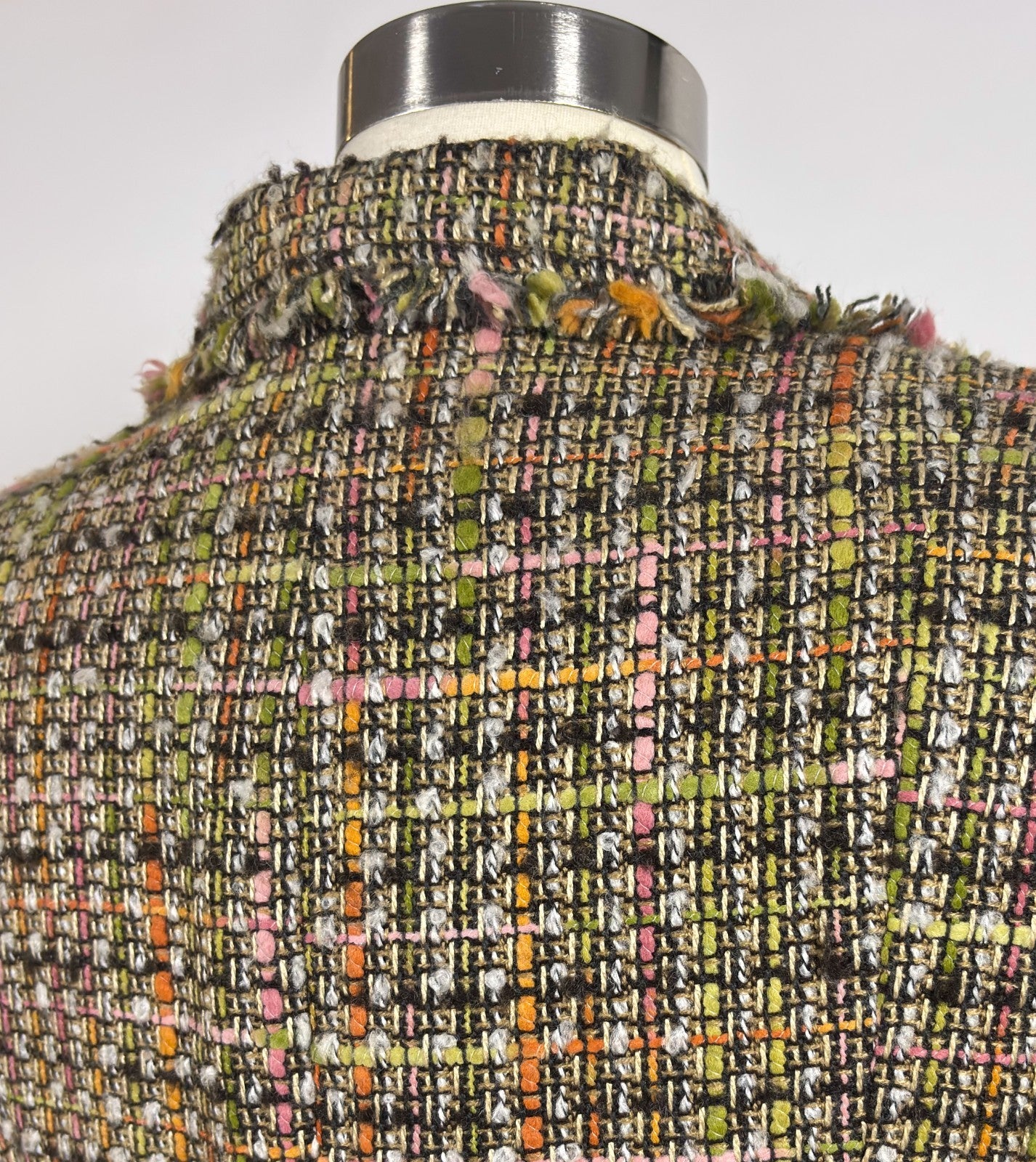 Textured multi-color tweed jacket featuring a classic woven pattern with subtle fringe trim at the collar. Rich blend of earthy tones—olive green, soft pink, cream, and hints of orange—gives it a sophisticated yet playful feel. Structured silhouette with timeless, tailored appeal.