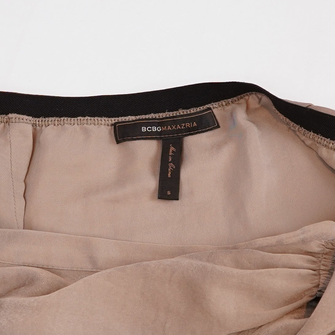 BCBGMaxAzria Stella Asymmetrical Gathered Midi Skirt in Beige Satin - S