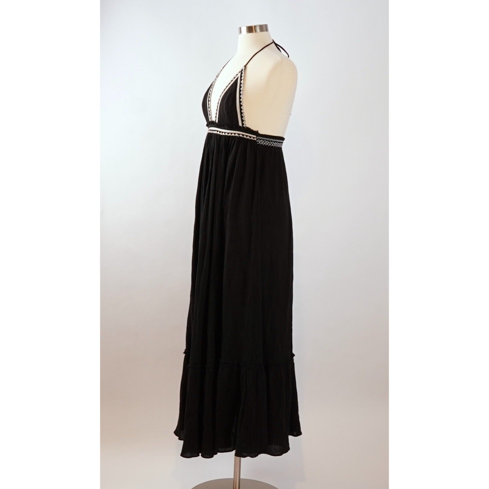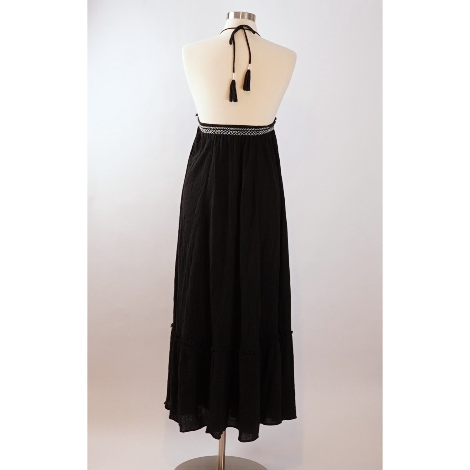 Crinkly cotton maxi dress featuring embroidery detailing and raw trim. Halter style neckline with an adjustable tie and a low back with adjustable band in back for an effortless fit.