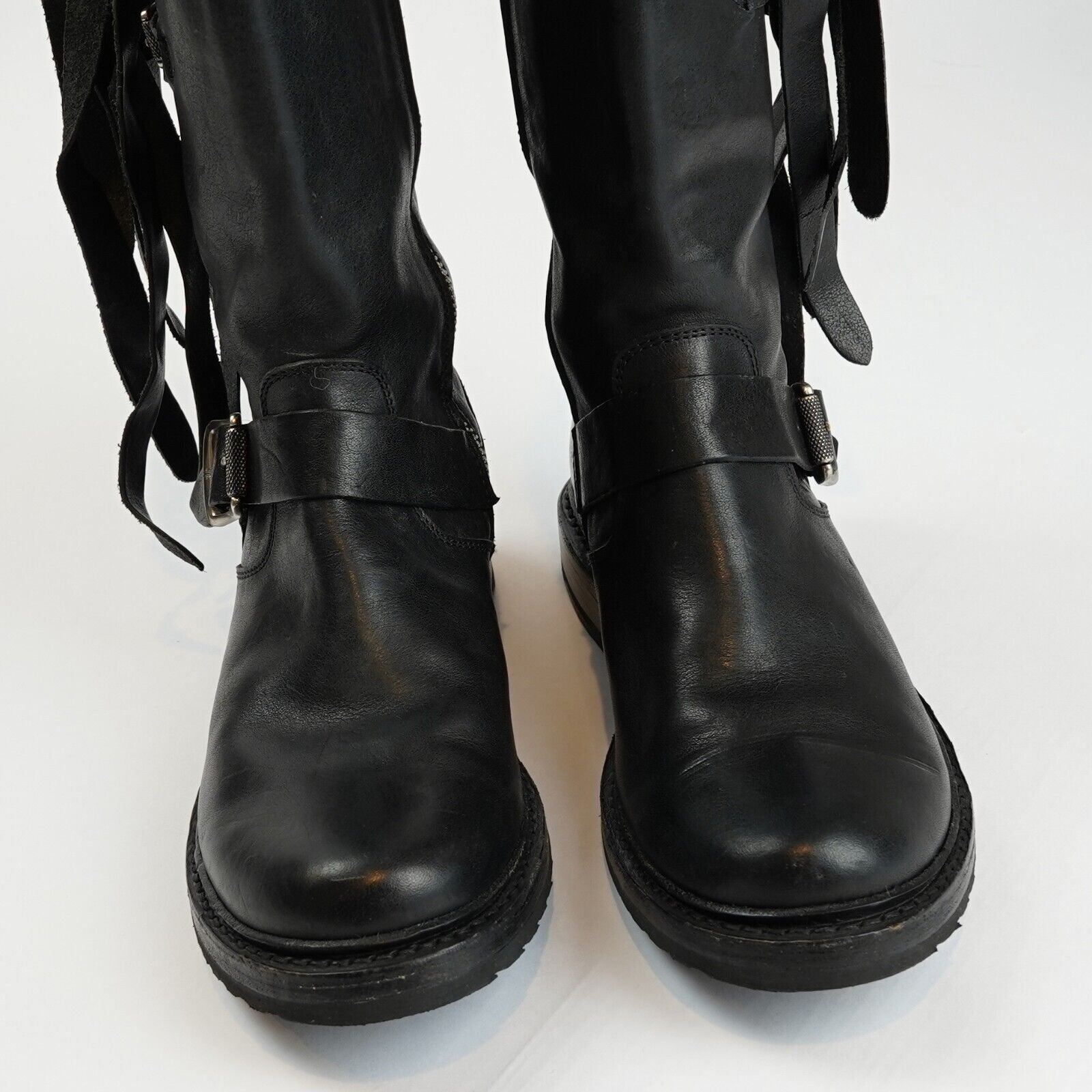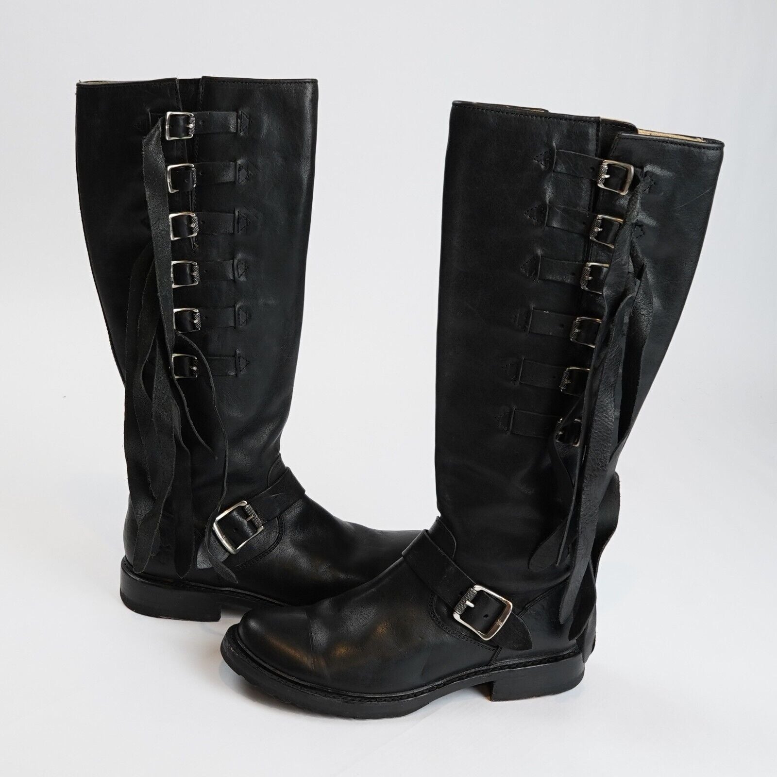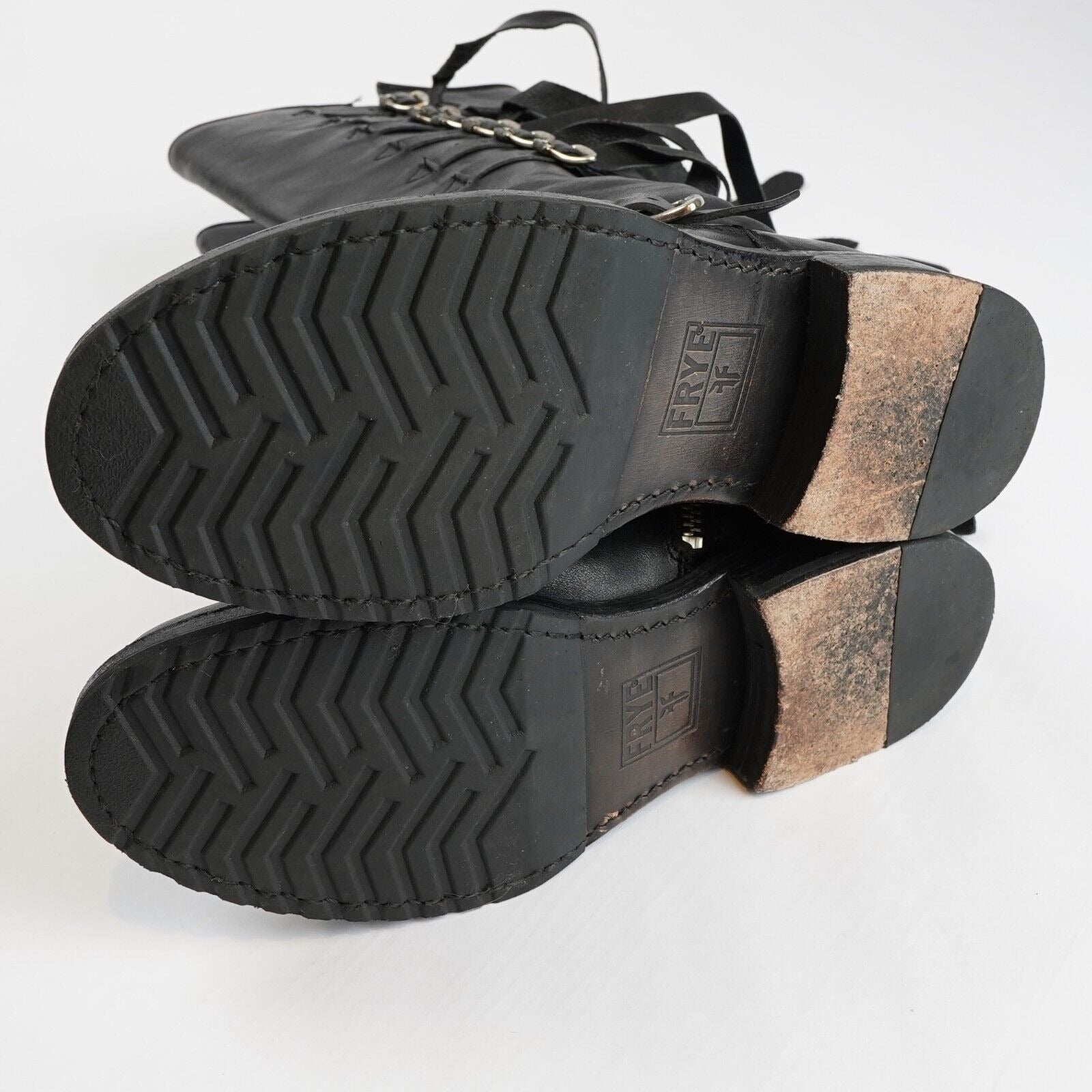Frye Veronica Strap Tall Black Leather Boots Black Fringe Moto Belted Knee - 7