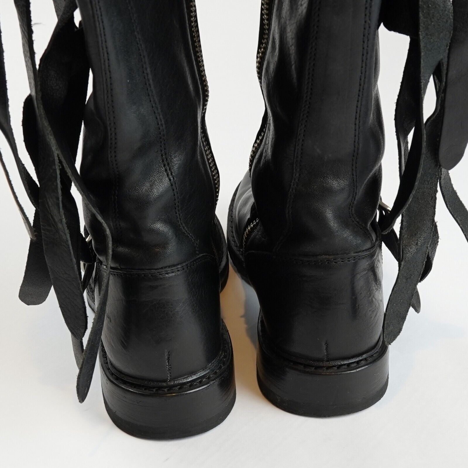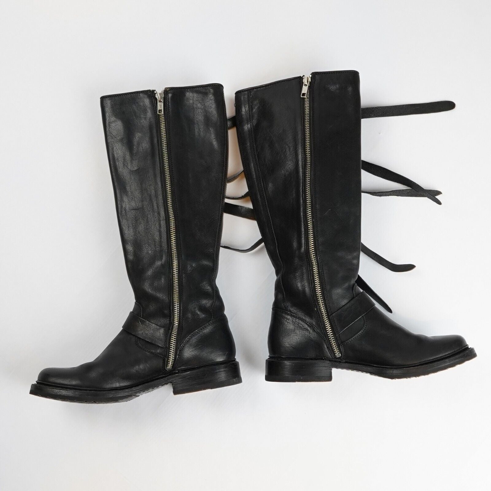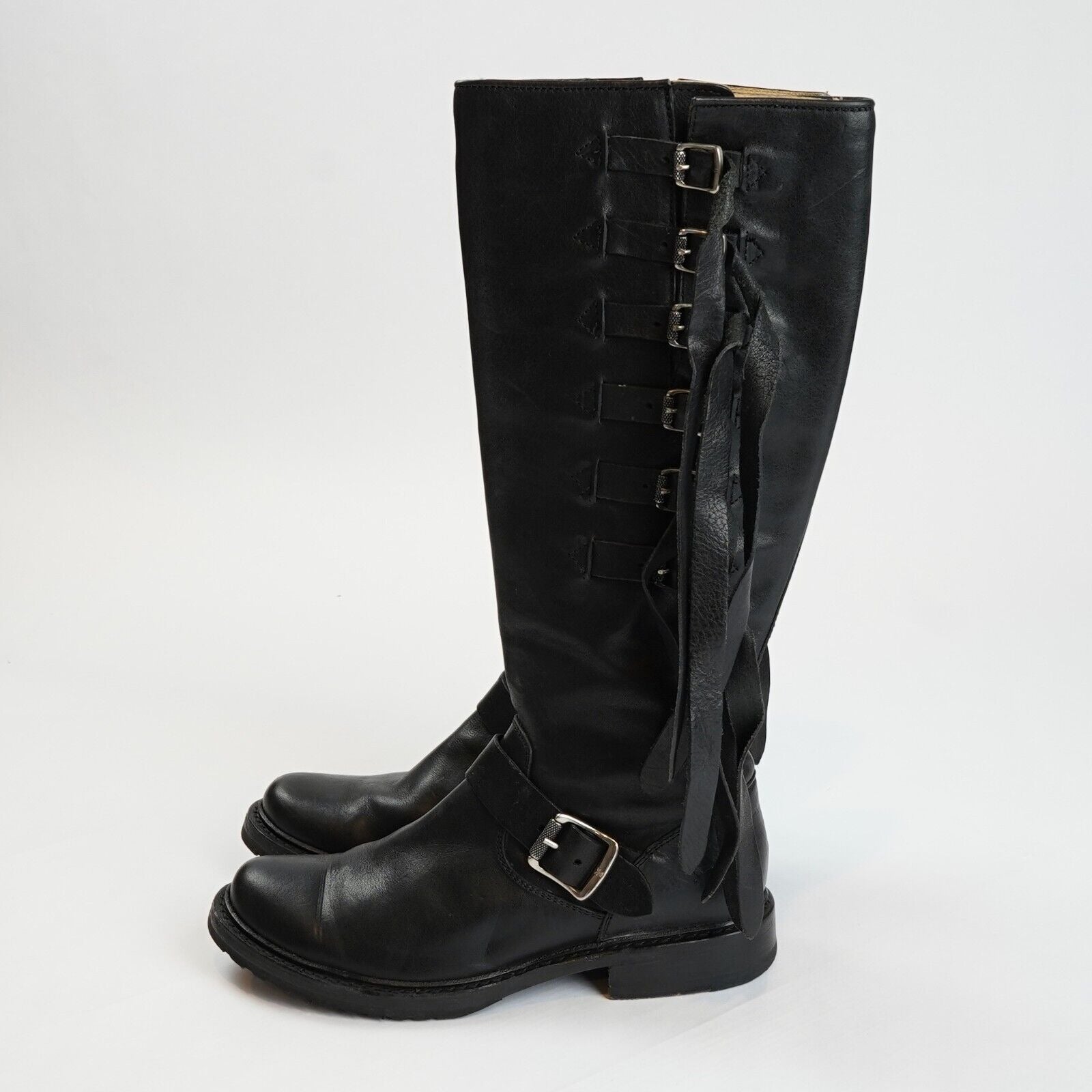 Frye Veronica Strap Tall Black Leather Boots Black Fringe Moto Belted Knee - 7