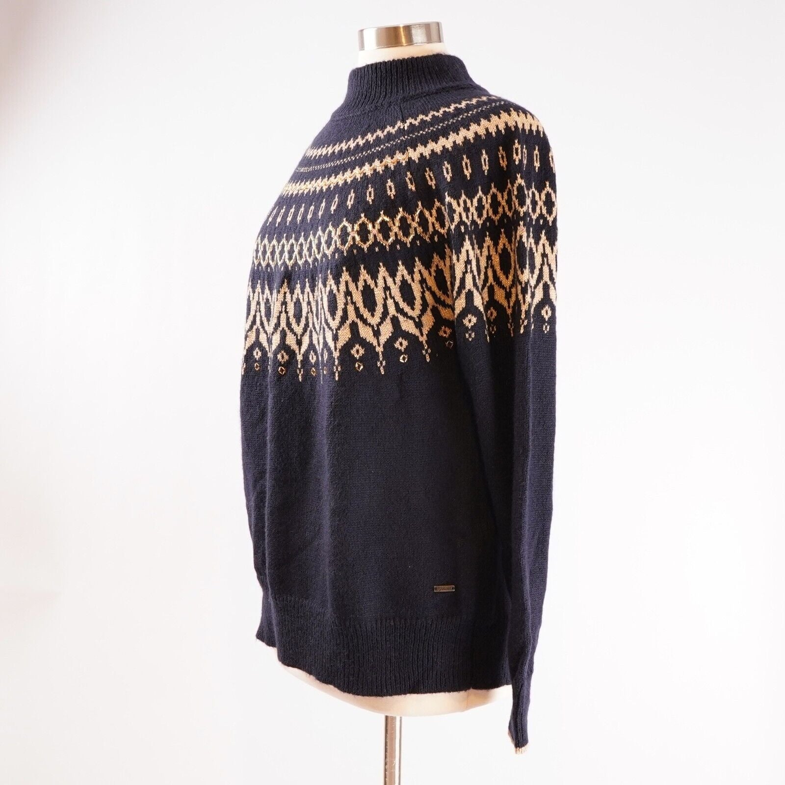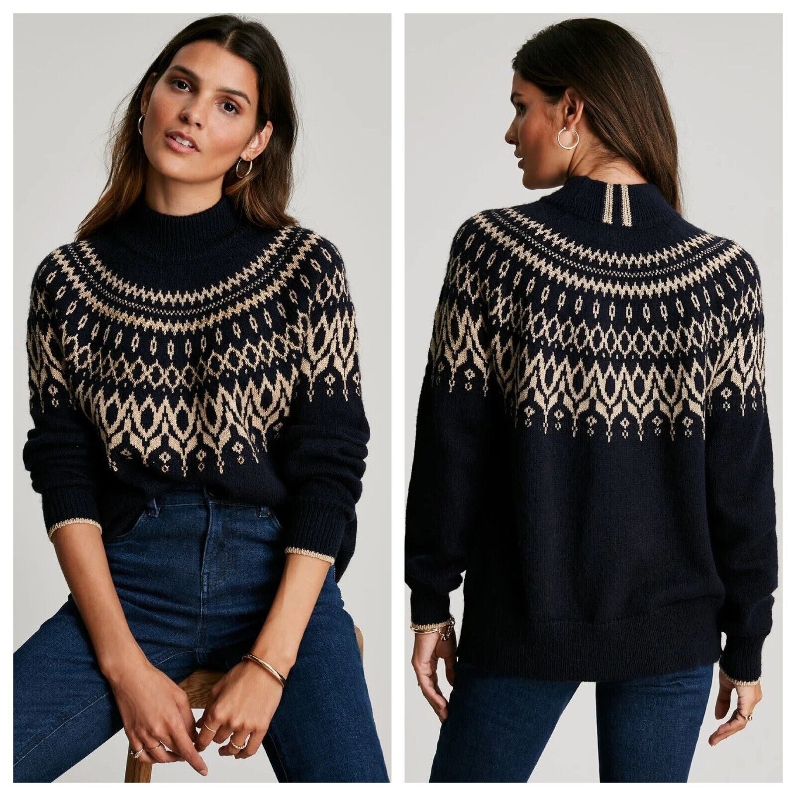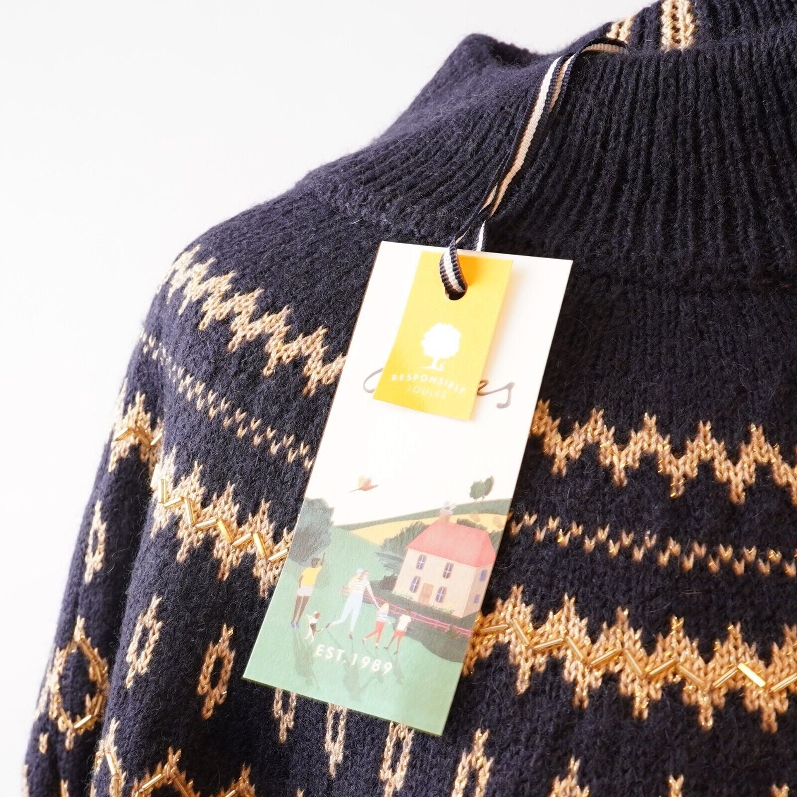 Classic intarsia fairisle design with intricate embellishment. Mock-turtle neck and raglan shoulders. Ribbed hem, neck and cuffs as well as a Joules metal tab to the hem. Contains 15% certified responsible wool and 8% certified responsible mohair.