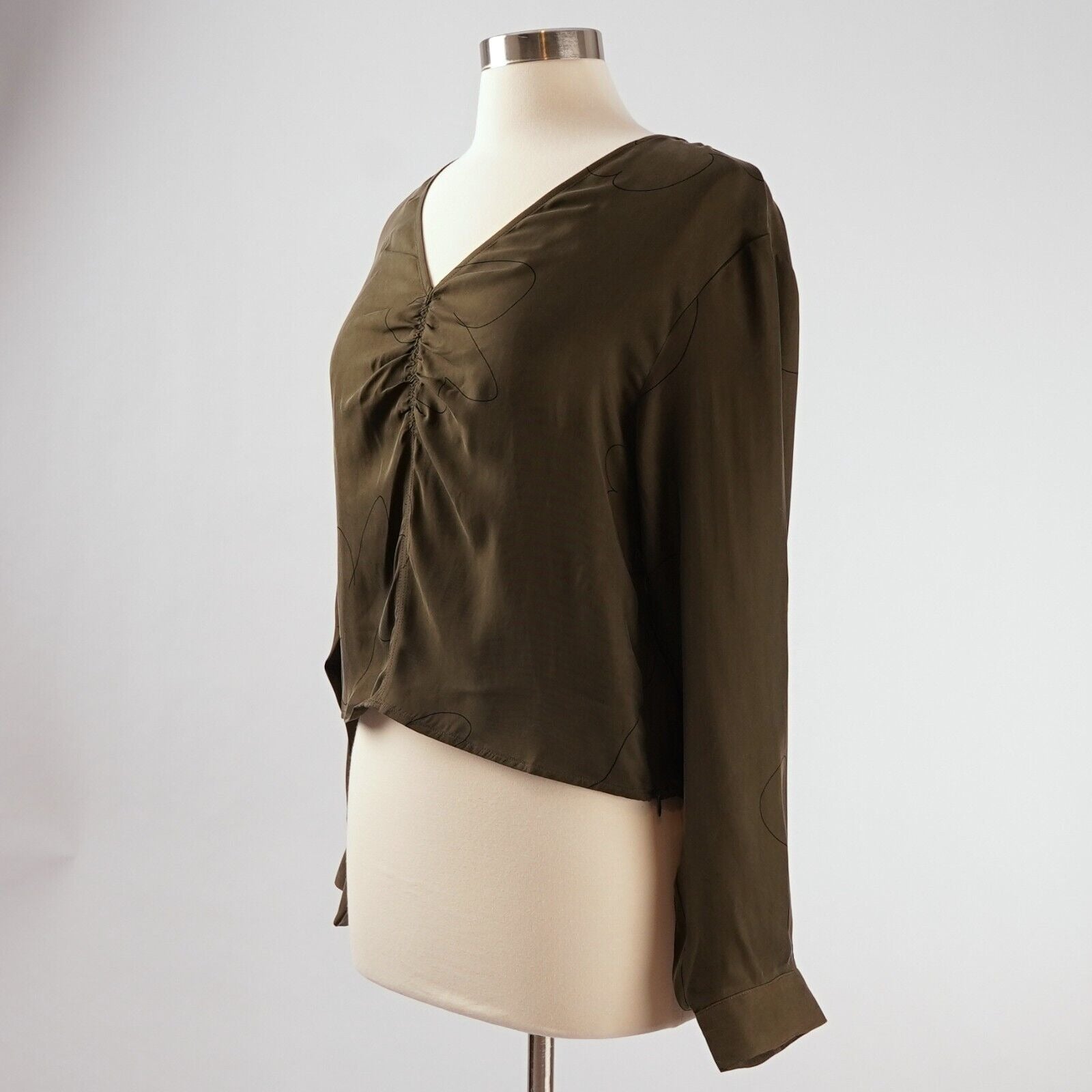 Relaxed with ruching along the front, this V-neck top is crafted of a drapey brushed fabric print with abstract line work. Pair with your favorite jeans for an effortless look.