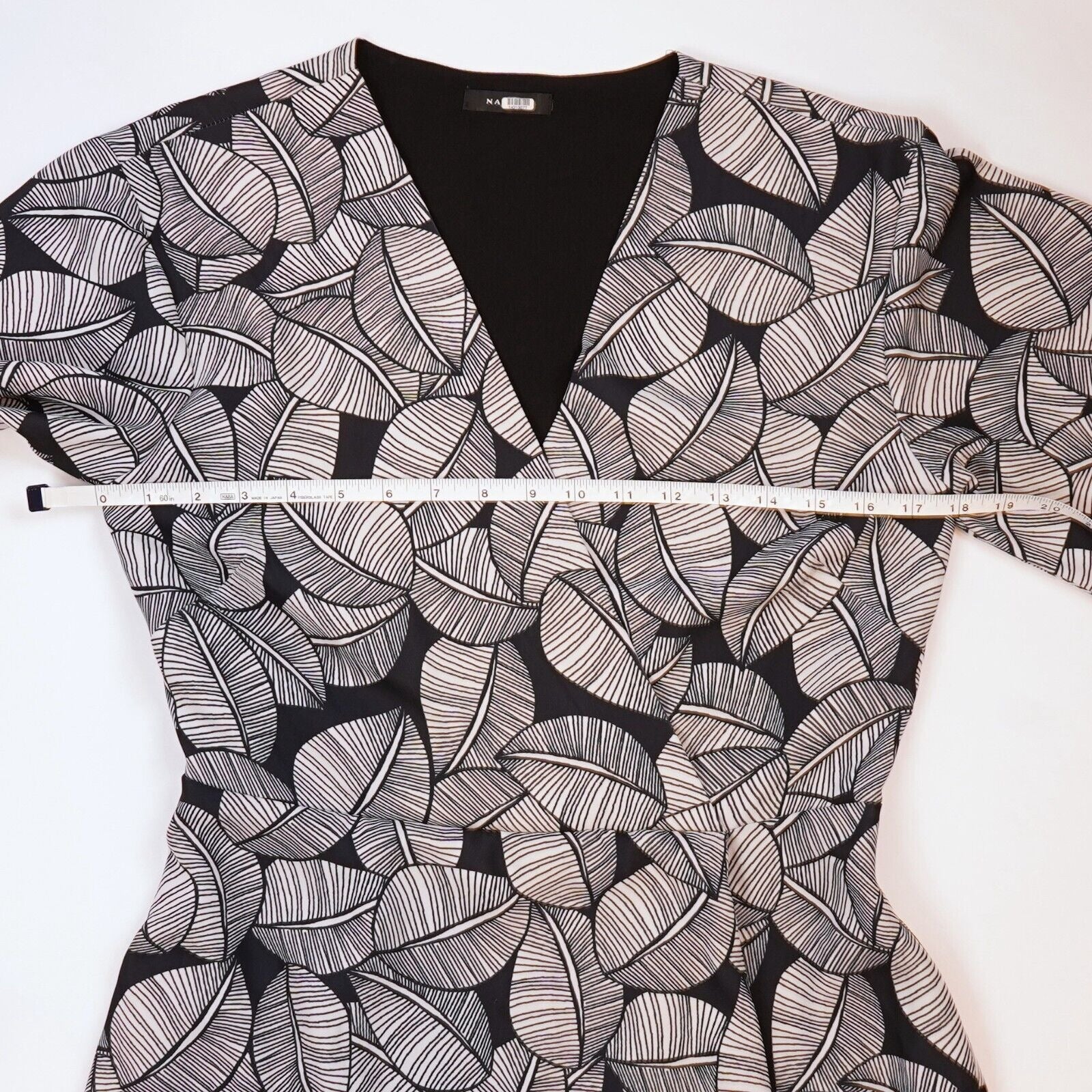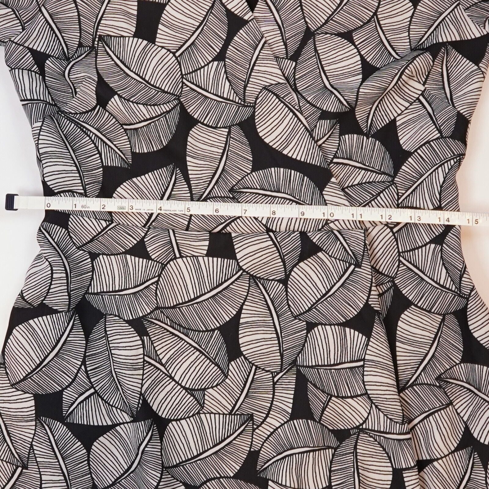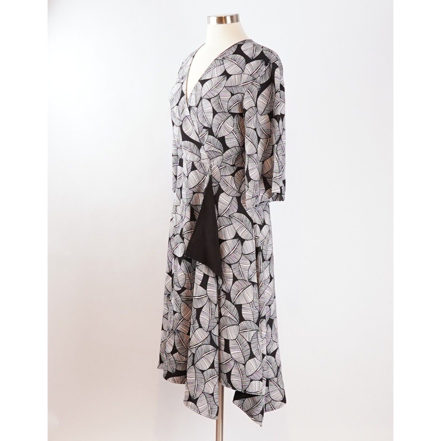 Black and white printed crepe (100% Polyester). Hourglass. Three-quarter sleeves. V-neckline. Hidden zipper closure. Fully lined. Pockets.