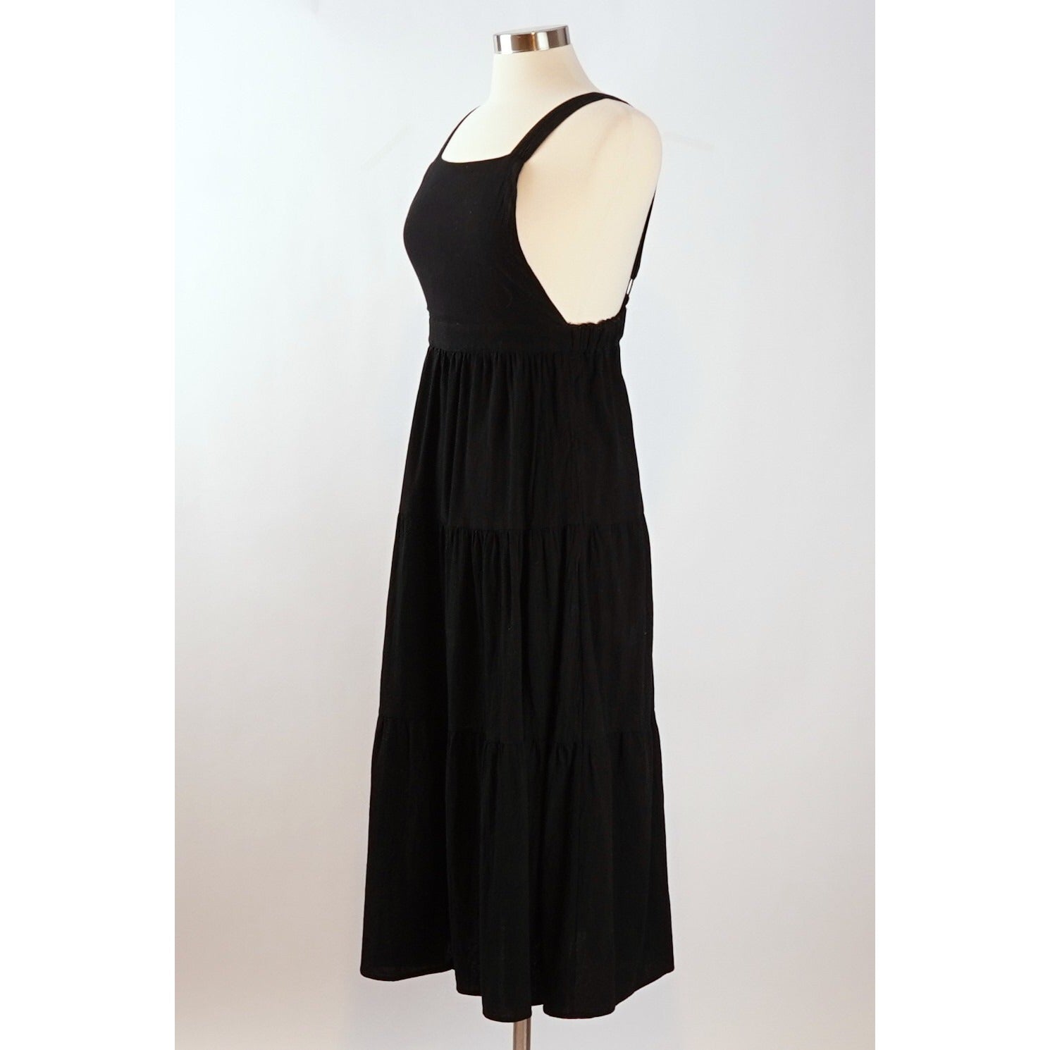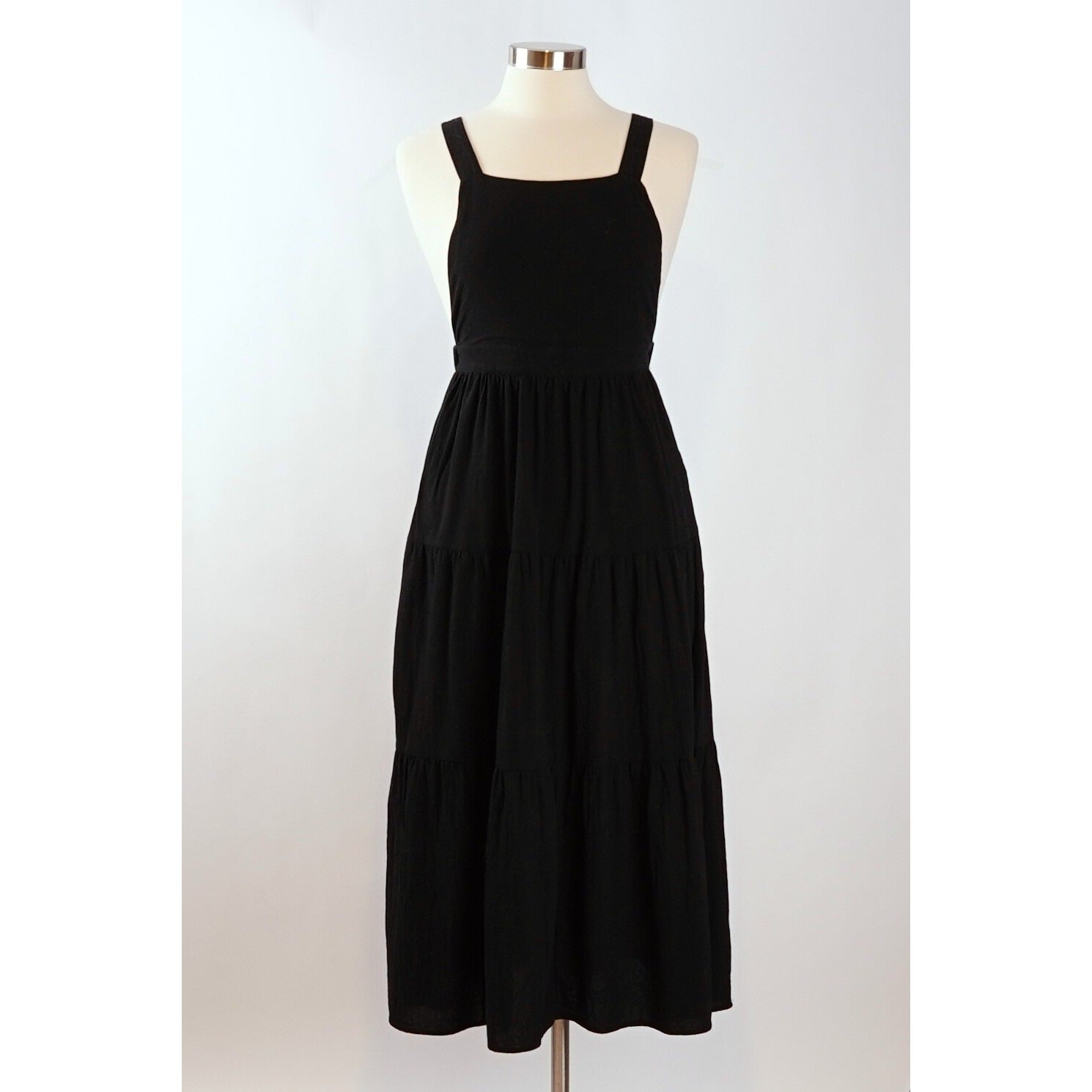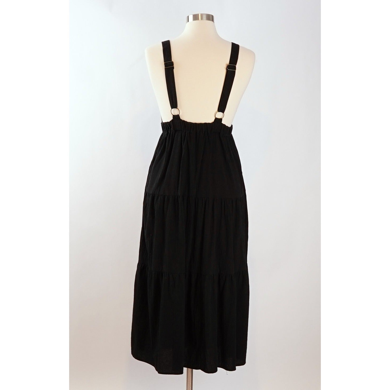 A romantic and classic pinafore dress with ruffles and a midi/maxi length.