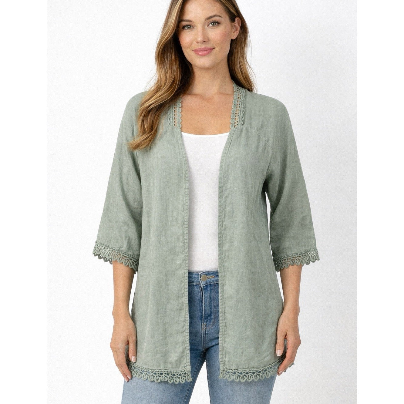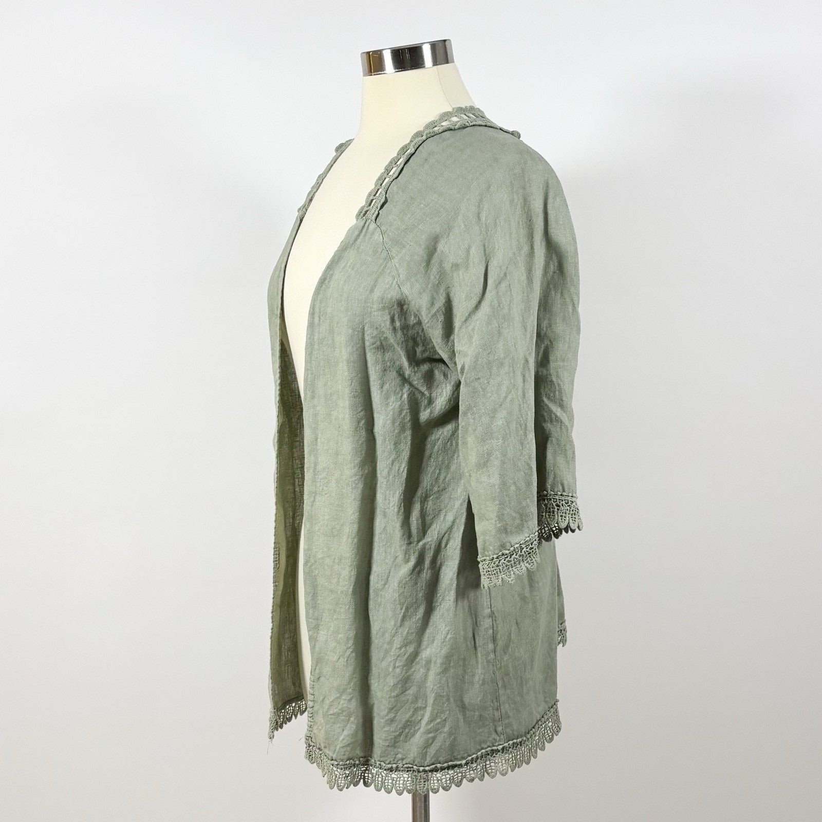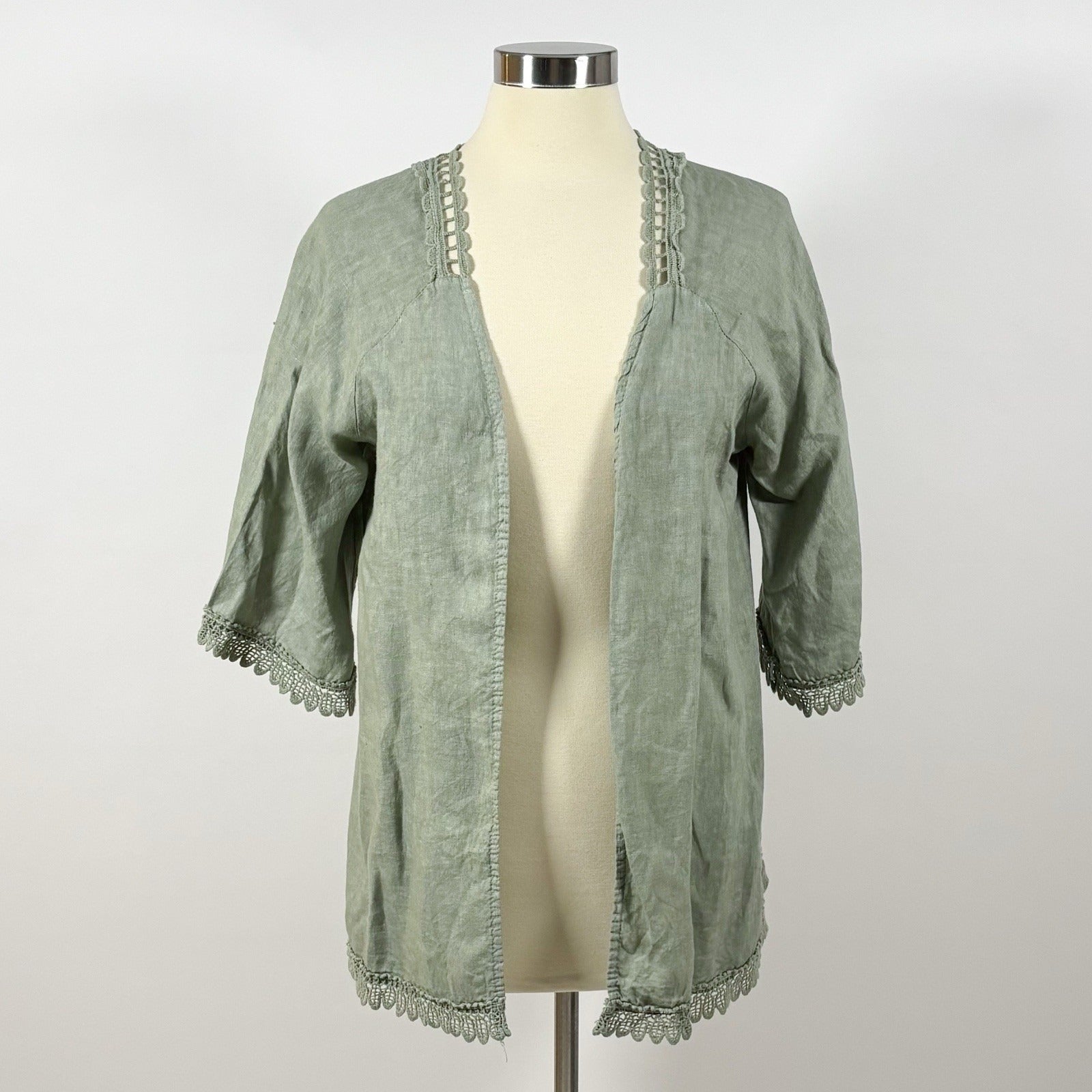 Valentina Naldi Linen Embroidered Kimono Cardigan Duster Sage Green - OS